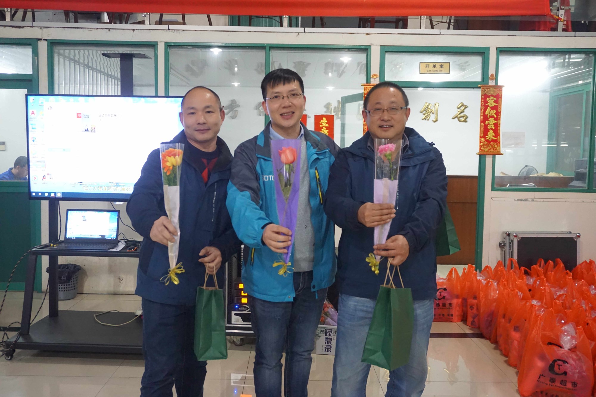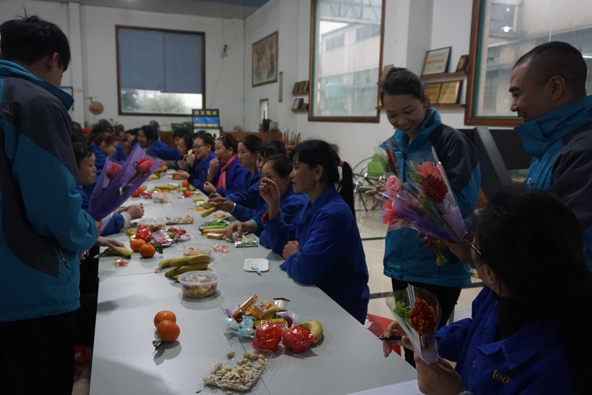 3月8號早7:30分,陰雨天,行政部及企業(yè)文化小組的成員就開始為下午的活動進行采購工作,采購水果、零食餅干、飲品、鮮花、禮品。同時在公司的婦女主任楊主任、各車間主任和TC成員開始組織男同事,出席下午“三八”女神節(jié)的獻花的活動。